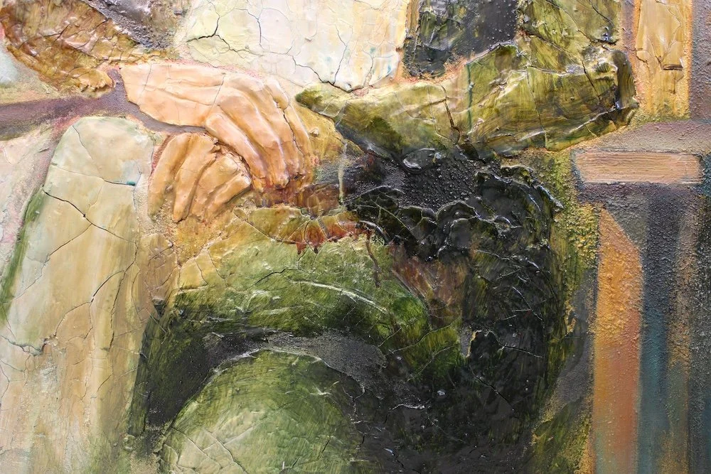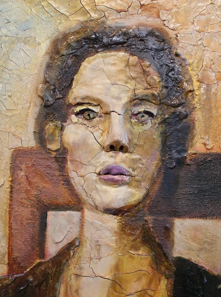 This painting uses clay that naturally cracks during the drying process, allowing the material itself to echo the passage of time and the vulnerability of the figure. The portrait is created, painted, aged, weathered, and marked by the process of its own making. Suspended in a state of endurance and shaped both by life and decay….. To me, portrait painting (and still lifes for that matter) is not just about rendering a likeness. It’s about exploring identity, perception, memory, and existence. I use abstraction, fragmentation, mixed media, and even material decay to challenge what a person even is. There is life in everything, and everything is connected.
