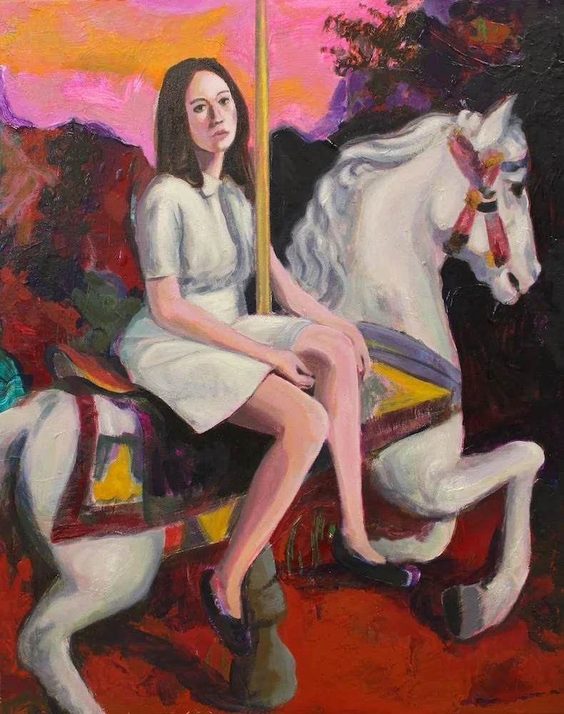 The carousel horse suggests cyclical movement, ritual, and stasis, as the woman exists in a threshold space, neither fully in the fantastical carnival nor in the grounded world, but suspended somewhere between them. This liminality echoes the other paintings in this series where figures embody states of transition, fragmentation, or quiet estrangement.